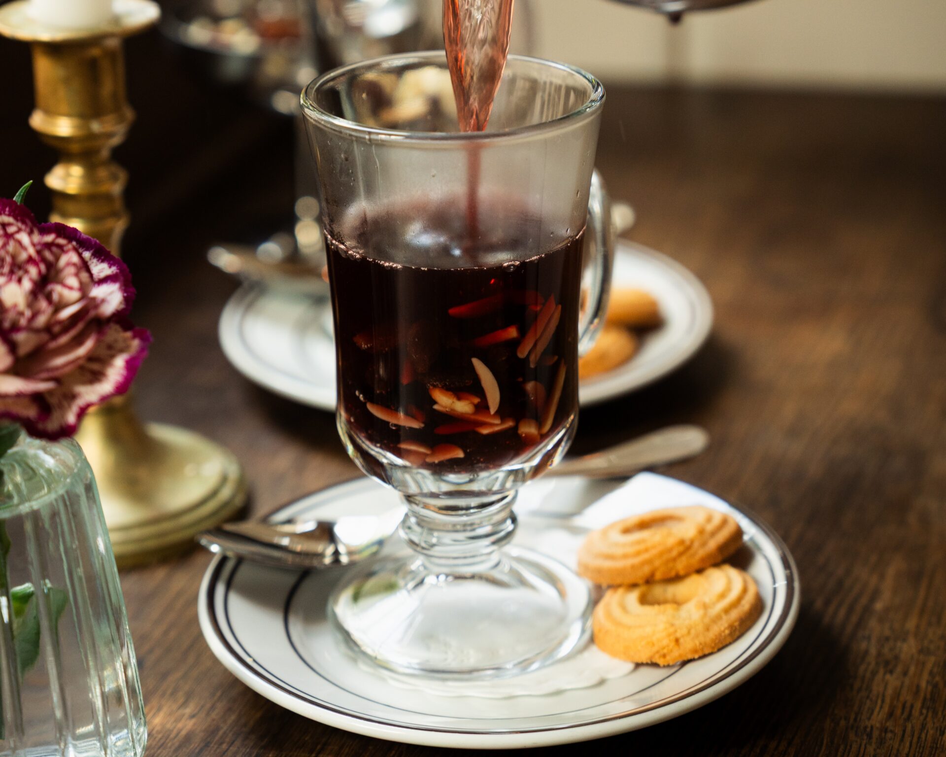 Vi serverer både rød og hvid gløgg, lavet efter den særlige opskrift fra vores cocktailbar TATA, sammen med lækre julesmåkager fra Juno Bakery.