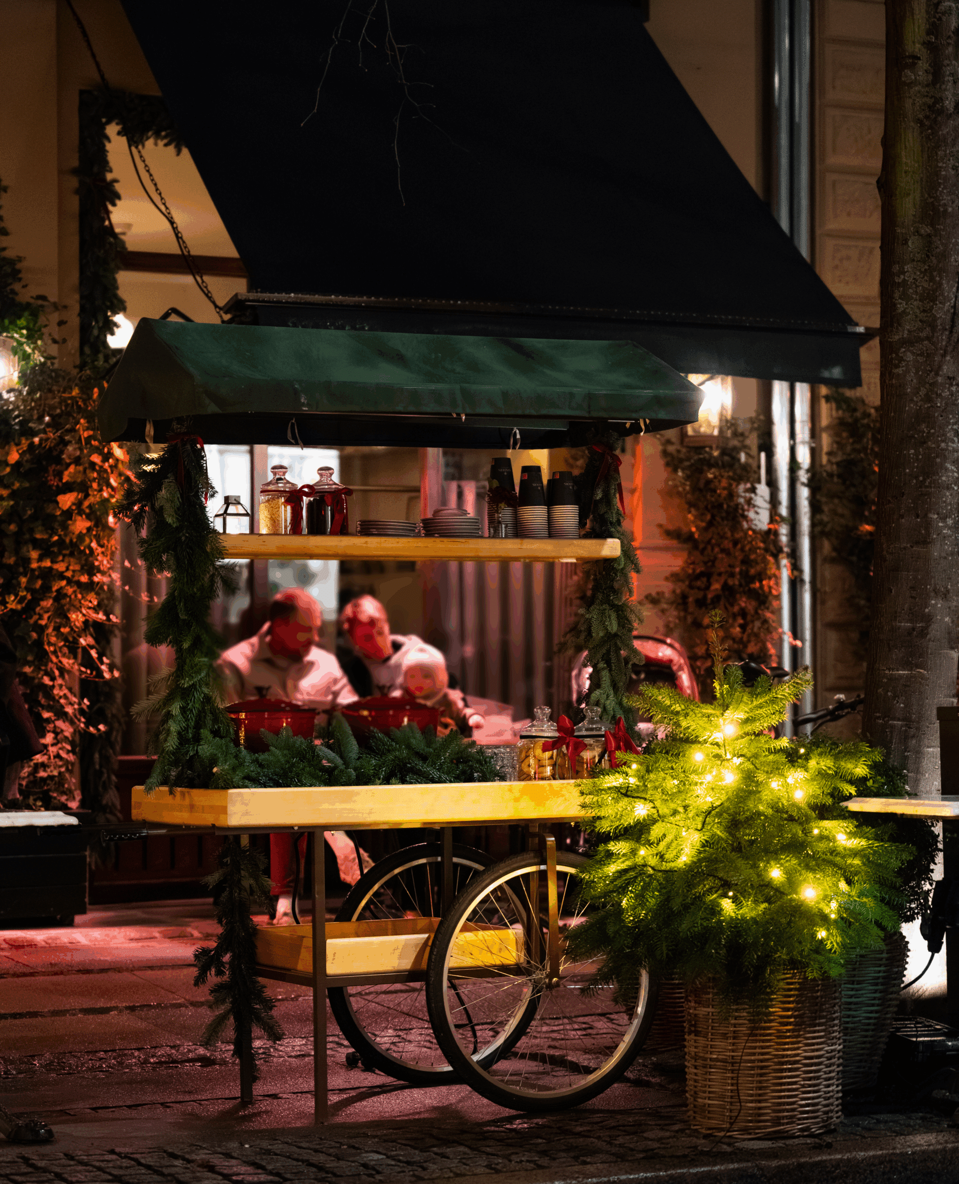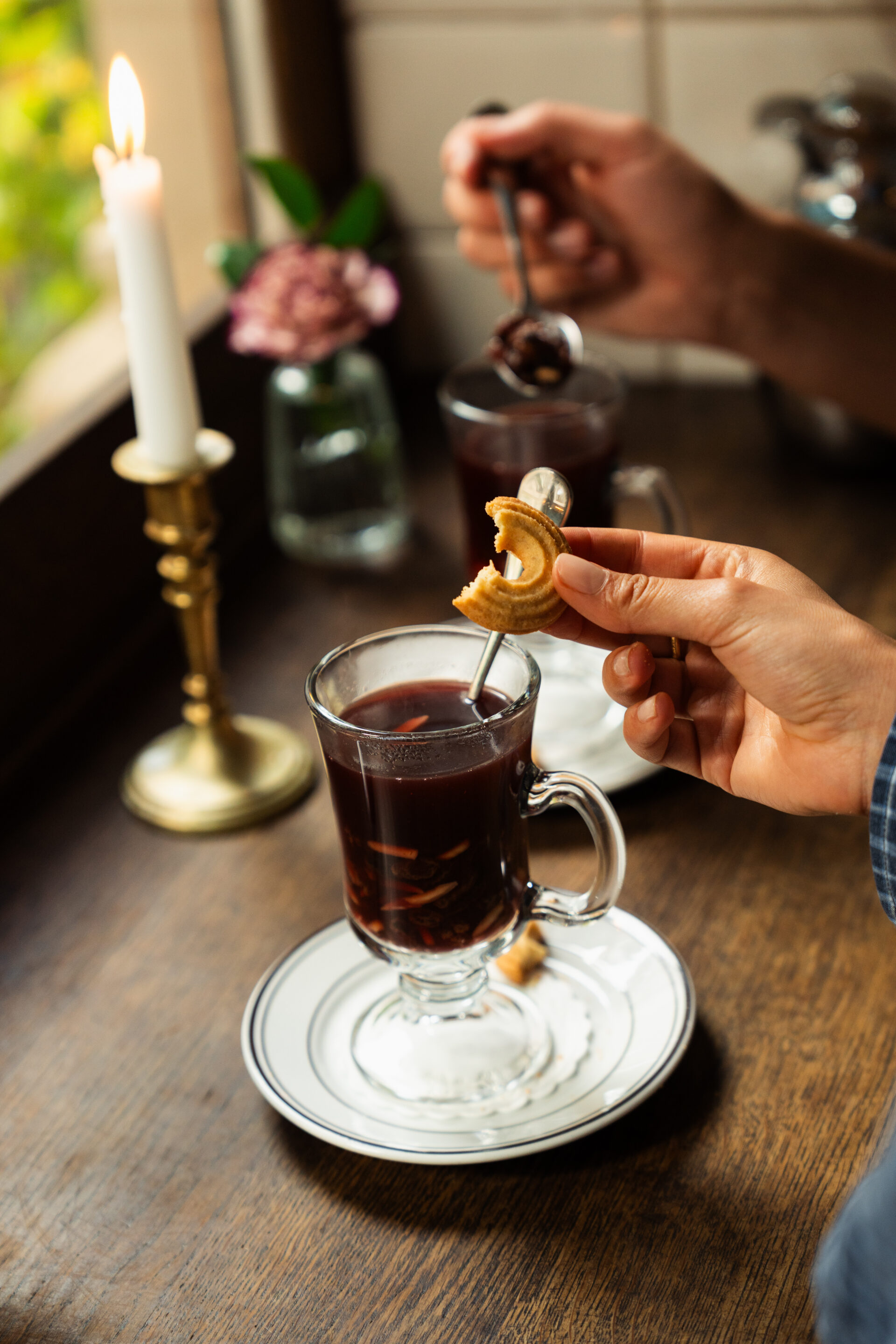 Vi serverer både rød og hvid gløgg, lavet efter den særlige opskrift fra vores cocktailbar TATA, sammen med lækre julesmåkager fra Juno Bakery.